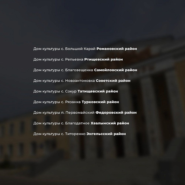 В 2026 году в Саратовской области продолжится ремонт сельских домов культуры. Об этом 30 января сообщил губернатор Роман Бусаргин, уточнив, что список объектов, где пройдут работы, определен в рамках региональной программы развития.Ремонт домов культуры на селе начался несколько лет назад. За это время уже обновлено около 200 объектов.