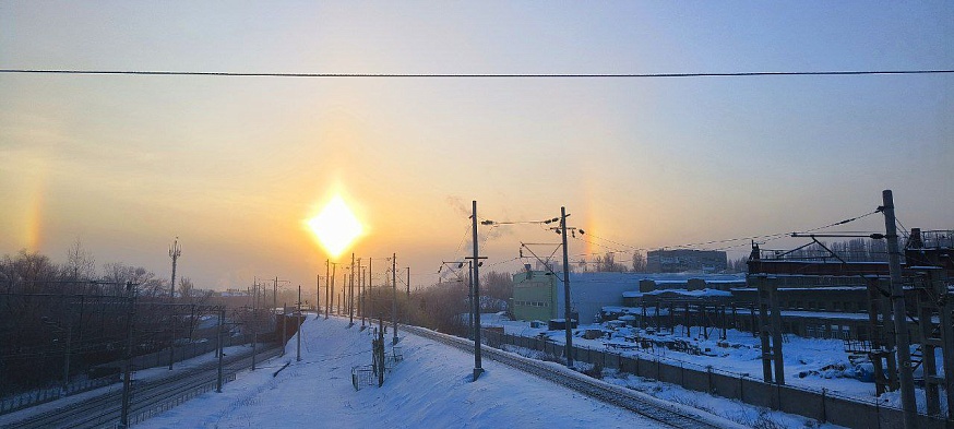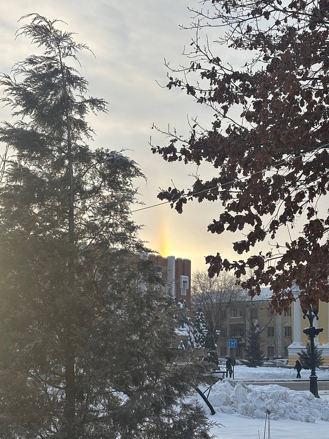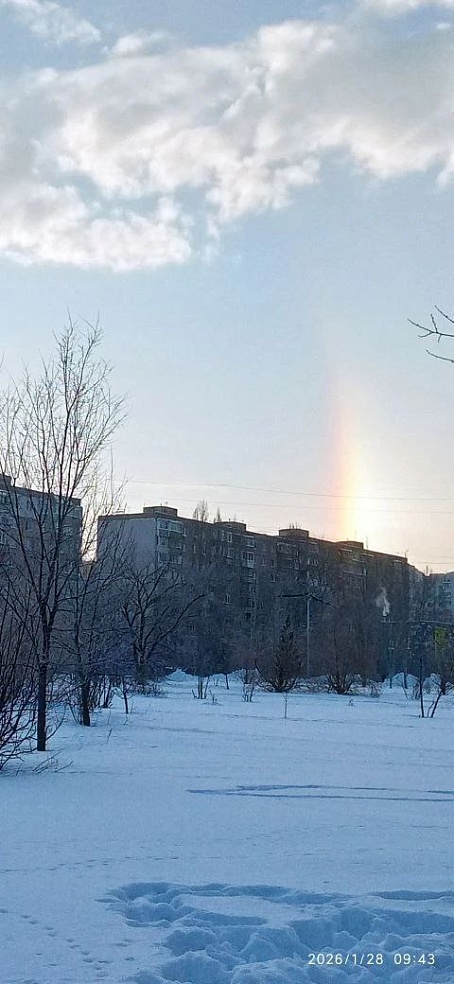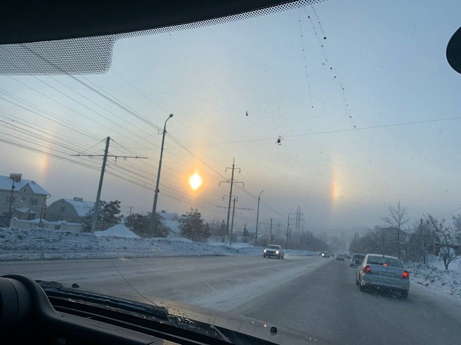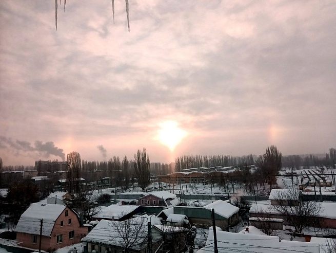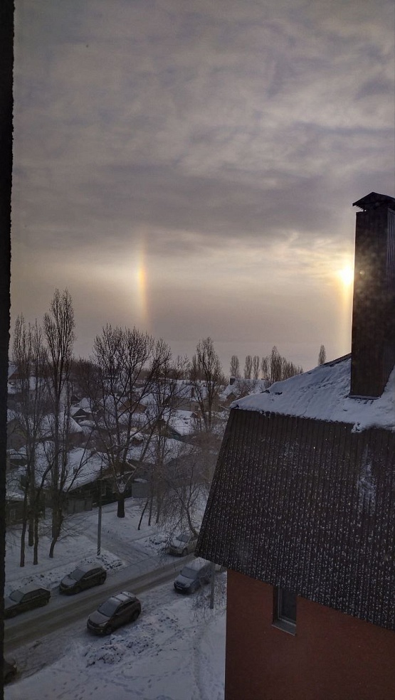 Утром 28 января саратовцы наблюдали оптическое явление под названием гало. Характерное световое кольцо вокруг Солнца заметили в Ленинском, Заводском, Волжском и Кировском районах города, а также в Хвалынском районе Саратовской области.Это явление возникает при безоблачном небе, сильном морозе и высокой влажности (в областном центре и по области сегодня местами утром было до -30 градусов - прим.ред). Гало возникает, когда в воздухе много ледяных кристаллов: солнечный свет, преломляясь в них, формирует вокруг светила дугу.