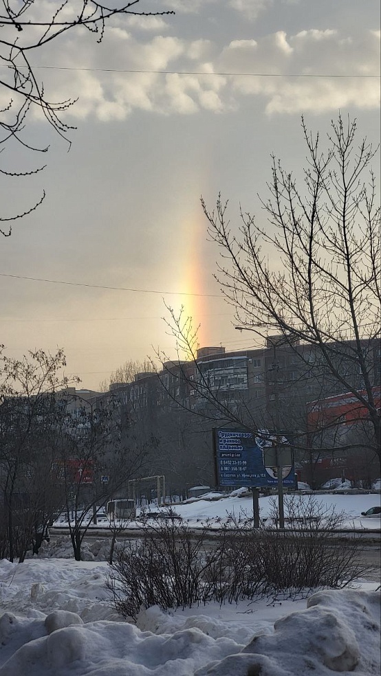 Заведующий кафедрой метеорологии и климатологии СГУ Максим Червяков в своих социальных сетях написал, что помимо гало также можно было наблюдать паргелий - это элемент гало, также называемый ложным солнцем. Паргелий наблюдают по обе стороны от Солнца. Явление также может выглядеть как радуга, - именно паргелий больше всего сегодня заметили саратовцы, судя по фото, которые прислали горожане и метеорологу, и в редакцию.