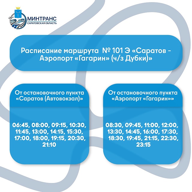На маршруте № 101 Э из Саратова можно будет уехать в 21:10, из аэропорта - в 23:15.