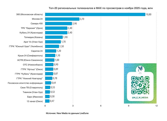 Лидером рейтинга остается федеральный канал "360" (Московская область) с 10,8 миллионами просмотров, за ним следуют "Москва 24" (3,7 млн) и "Самара 450" (2,9 млн).