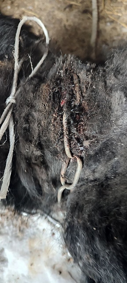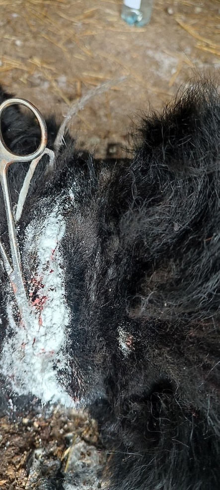 Ветеринарный врач провел операцию: рассек кожу, чтобы извлечь застрявшие звенья, а затем тщательно обработал рану антисептиками. Швы накладывать не стали — рана будет заживать естественным путем.