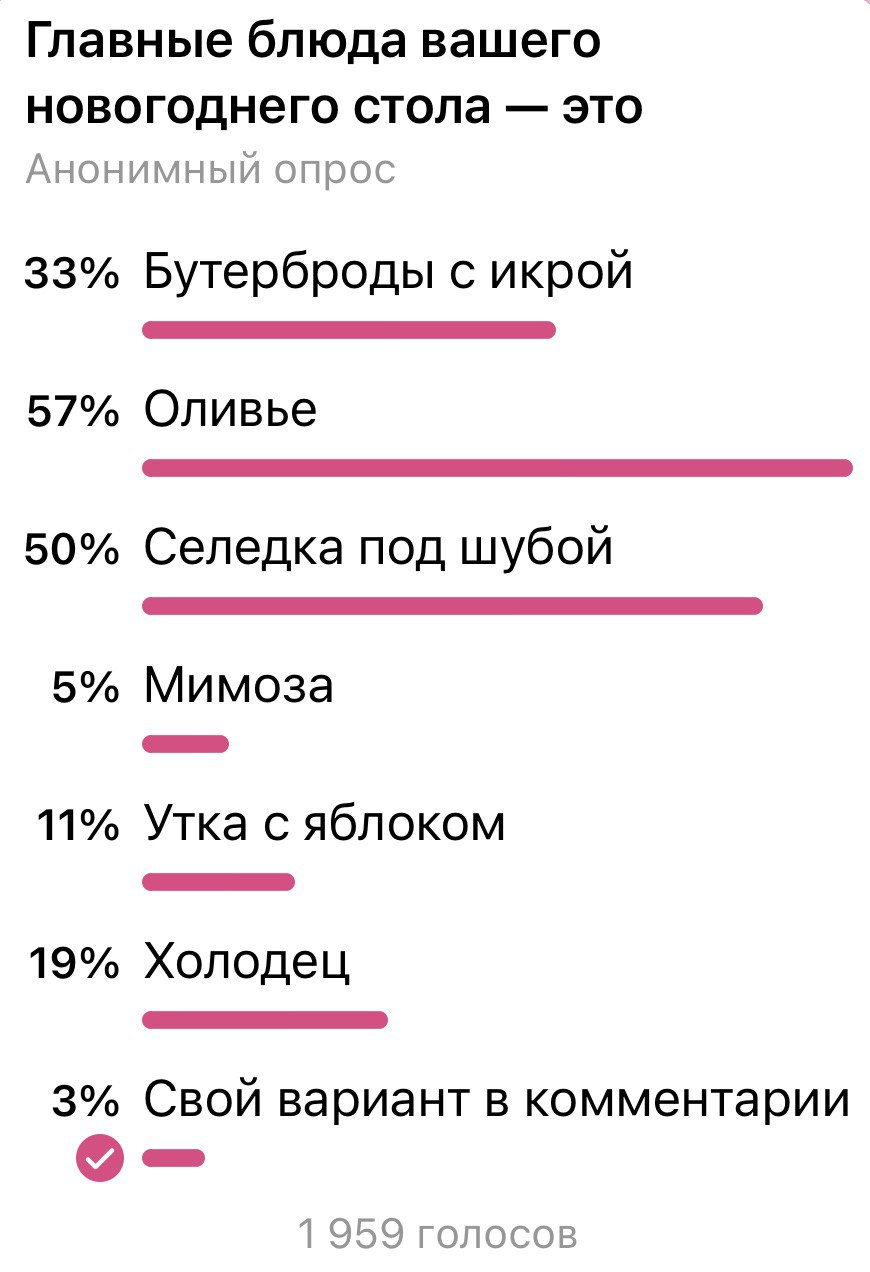 В Саратове жители города также поделились своими любимыми блюдами. На первом месте у нас оказался салат "Оливье" (57%), а на втором - "Селедка под шубой" (50%). Почетное третье место досталось бутербродам с икрой — 33% проголосовавших отдают предпочтения именно им. На 4 месте оказалось блюдо, насыщенное коллагеном и различными аминокислотами — холодец, 19% саратовцев для новогоднего стола выбирают именно его. 11% запекают утку с яблоками, и лишь 5% готовят салат "Мимоза". В комментариях респонденты рассказали, что не могут представить свой новогодний стол без салата из курицы и ананасов, бутербродов со шпротами, а также без мандаринов.