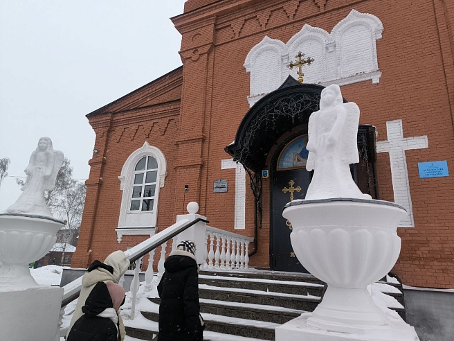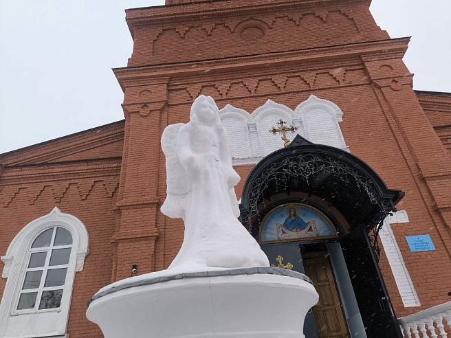 У входа в церковь Петровска появились снежные фигуры. Их сделал местный мастер - Алексей Новичков.Как рассказал глава района Максим Калядин, в начале декабря долго не было снега, а потом ударили морозы.