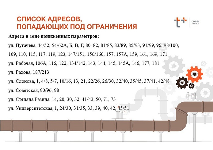В четверг, 18 декабря, "Т Плюс" приступит к ремонту теплосети на пересечении улиц Степана Разина и Кутякова.В связи с этим отключат тепло и горячую воду в домах Фрунзенского и Кировского районов. В ряде домов температура батарей и горячей воды может быть ниже, чем обычно.