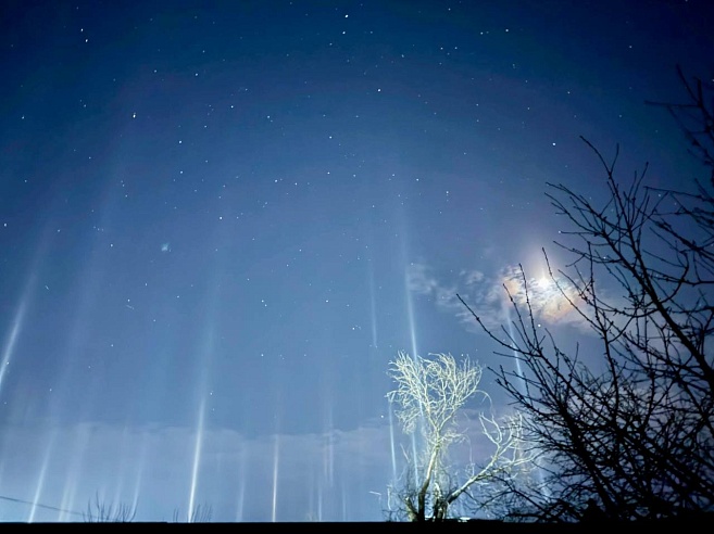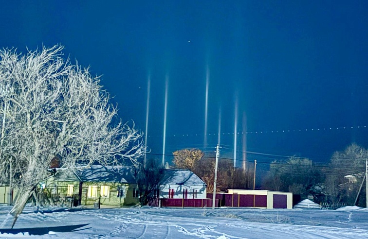 Вечером 23 января жители Питерского района Саратовской области стали свидетелями необычного зрелища — в небе над селом Мироновка появились световые столбы. Как пишут федеральные СМИ, за явлением также наблюдали жители Воронежа, Курска и Самары.Яркие лучи, словно небесные фонари, уходили в звездное небо. Фотографии этого редкого природного явления опубликовал глава муниципалитета Дмитрий Живайкин. Такое явление обычно происходит в морозную погоду, когда свет отражается от кристаллов льда в атмосфере.